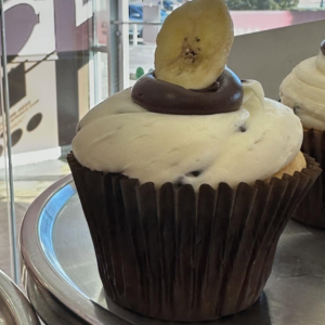 Vanilla cupcake with pieces of bananas topped with buttercream icing, chocolate chips, and chocolate Drizzle.