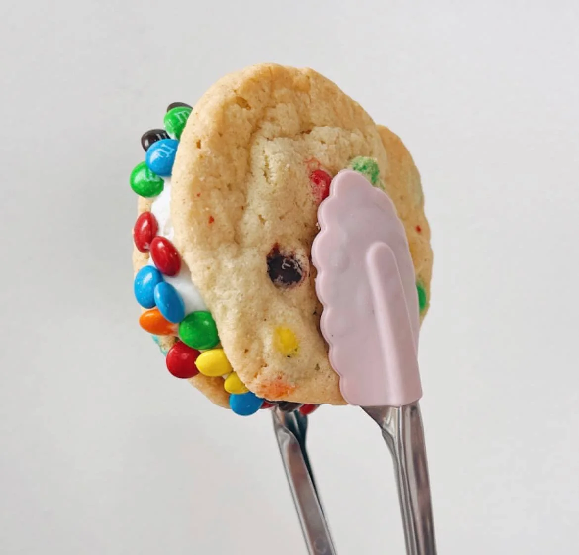 M&M Cookies filled with buttercream and rolled in mini m&ms